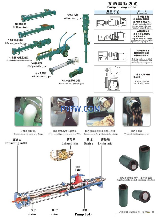 G型单螺杆泵是一种内啮合的密闭式螺杆泵,属转子式容积泵,由于这种泵对介质的适应性强,流动平稳,压力脉动小,自吸能力高,这是其它任何泵种所不能替代的。我厂对国外生产的单螺杆泵及国内同行业的产品,作了分析与研究,博取众长,对自已的产品进行不断的改革创新。目前我单位的产品已自成一体系,零件少,结构紧凑,体积小,维修简便,转子和定子是本泵的易损件,结构简单,便于装拆。扬程为60-120m,可满足广大用户对单螺杆泵的不同需求。